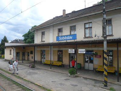 で、プラハ駅から電車に乗るわけですが、駅の掲示板はチェコ語しか書いてなくて、イマイチ行き先に自信が無いので出発前に再度、駅員に確認。納得してコンパートメントに戻ろうとしたところ「地球の歩き方」を持っていた私に日本人が声をかけてきた。要は行き先があっているか自信が無いと言う(私と一緒である)。相手は一人旅だし行き先も同じなので何かの縁と一緒にチェスキー・クルムロフへ。乗ったのはこんな感じの電車。