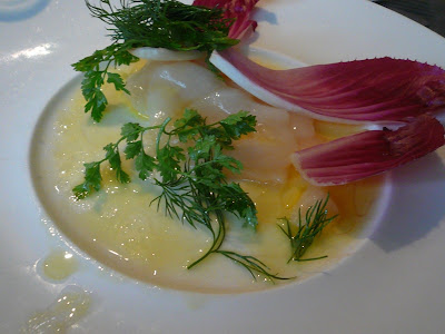 3時間ほど堪能したあとは、疲れたこともありお昼ご飯に向かいます。オルセー近辺で調べてあった魚料理がうまいとのお店へ。全然メニューが読めません。前菜、メイン、デザートのコースを注文。前菜はホタテだったようだ。うまい!!